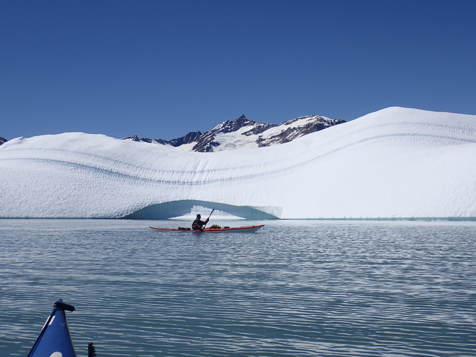 Stemningen er rolig og eventyrlig – det er tydeligt, at Carsten nyder den unikke oplevelse af kajaksejlads i det arktiske landskab.